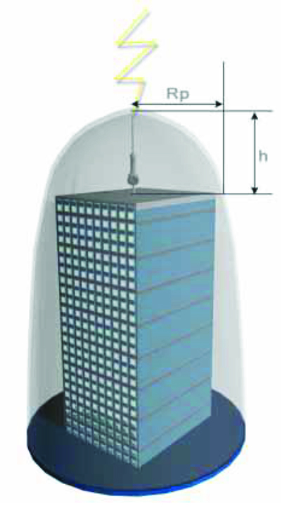 - h(m): height between the lightning rod tip and the highest point to protect.