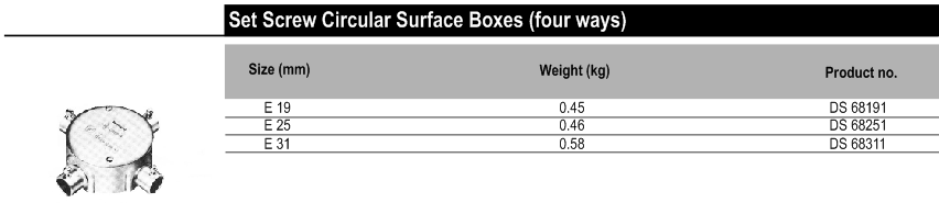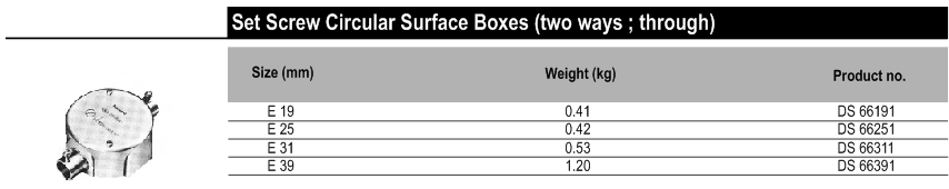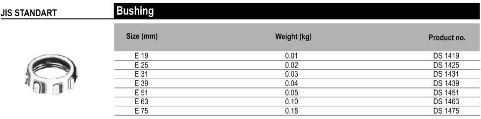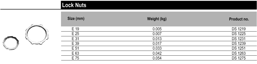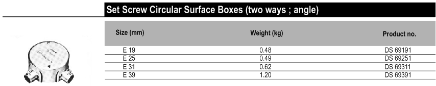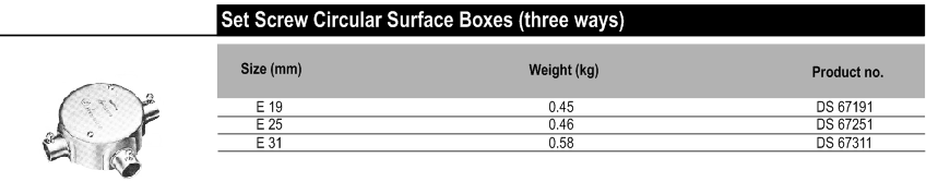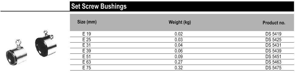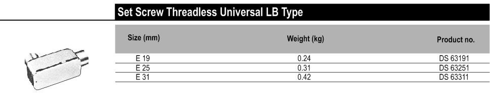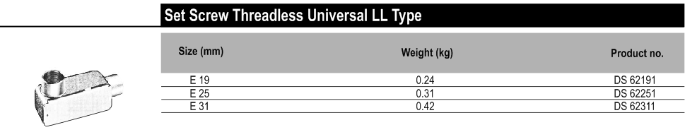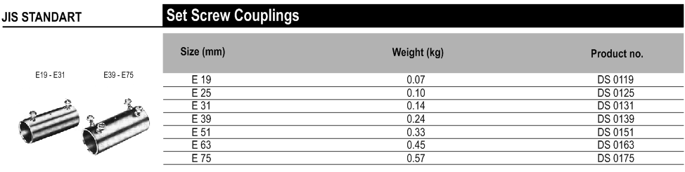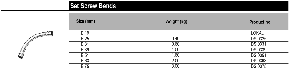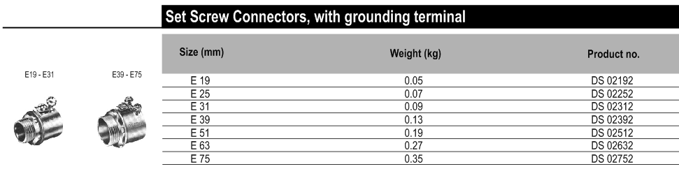 ACCESSORIES FOR E TYPE CONDUIT - Set screw (threadless) Couplings, Set screw (threadless) Connectors (with grounding terminal), Set screw threadless Bends.